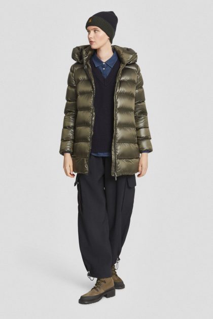 Piumino medio-lungo verde militare con cappuccio staccabile